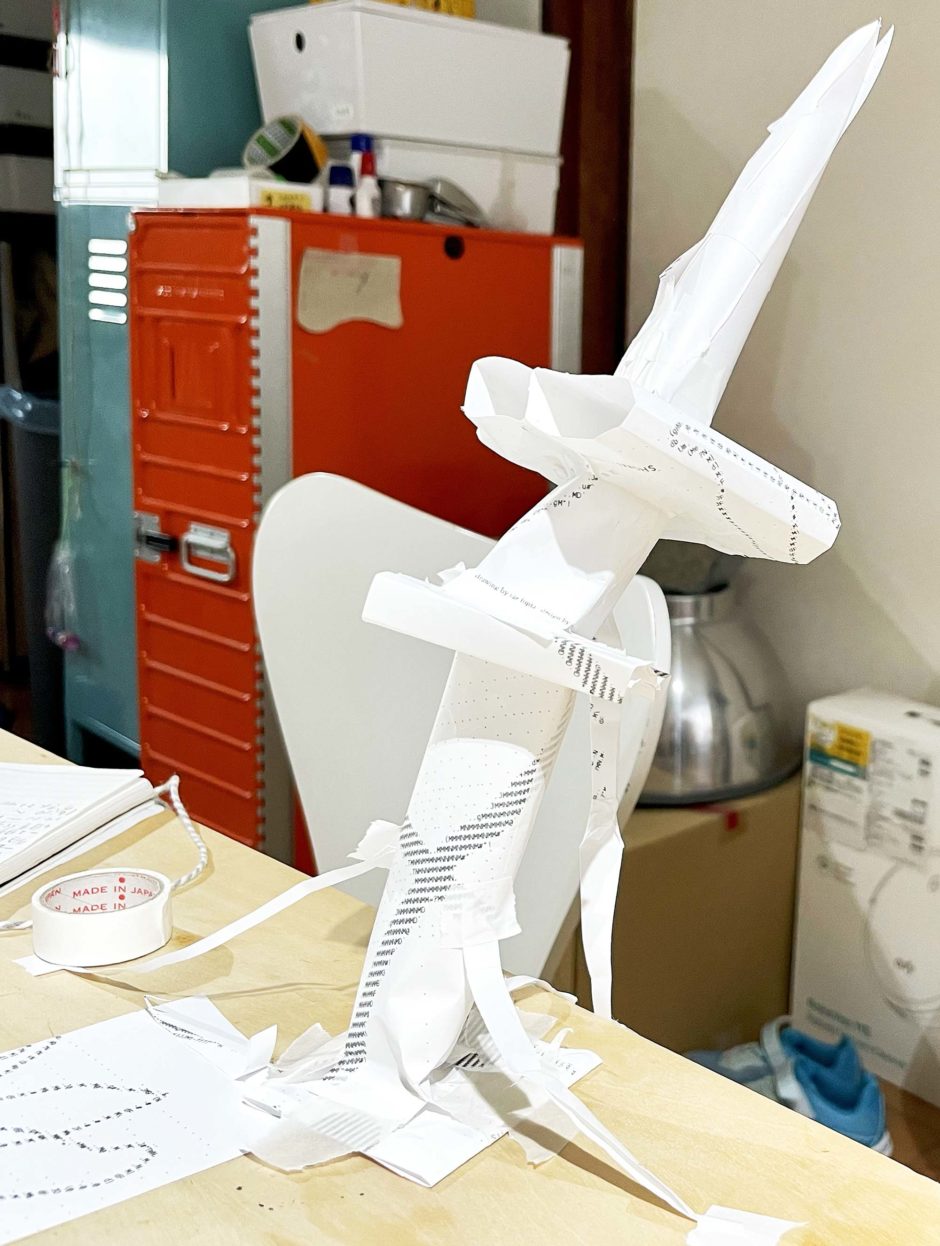 あまった紙を使って粘土のように彫刻を作ろう。高いもの、低いもの、固まったもの、ひらひらのもの、自由自在に作れます。出来上がった作品は、4Fのスタジオ・410号室に展示します!